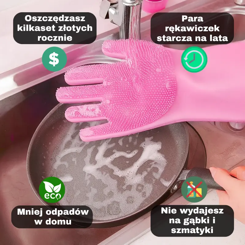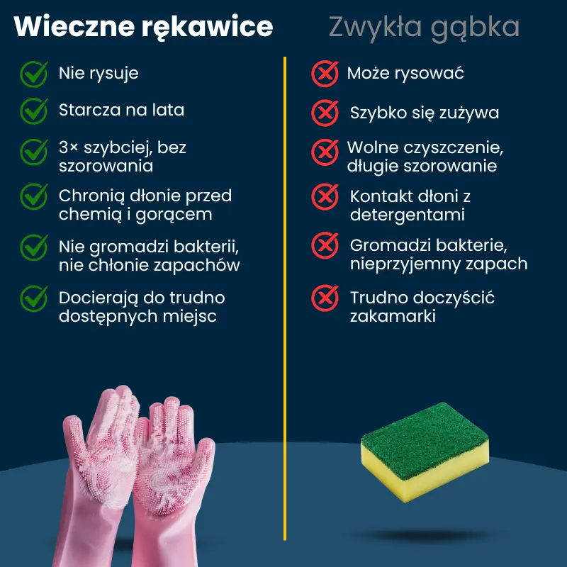 Wieczne Rękawice skutecznie czyszczą naczynia, warzywa, owoce i każdą powierzchnię w domu. Miękkie silikonowe wypustki usuwają brud bez wysiłku – szybko, dokładnie i bez potrzeby używania gąbek.